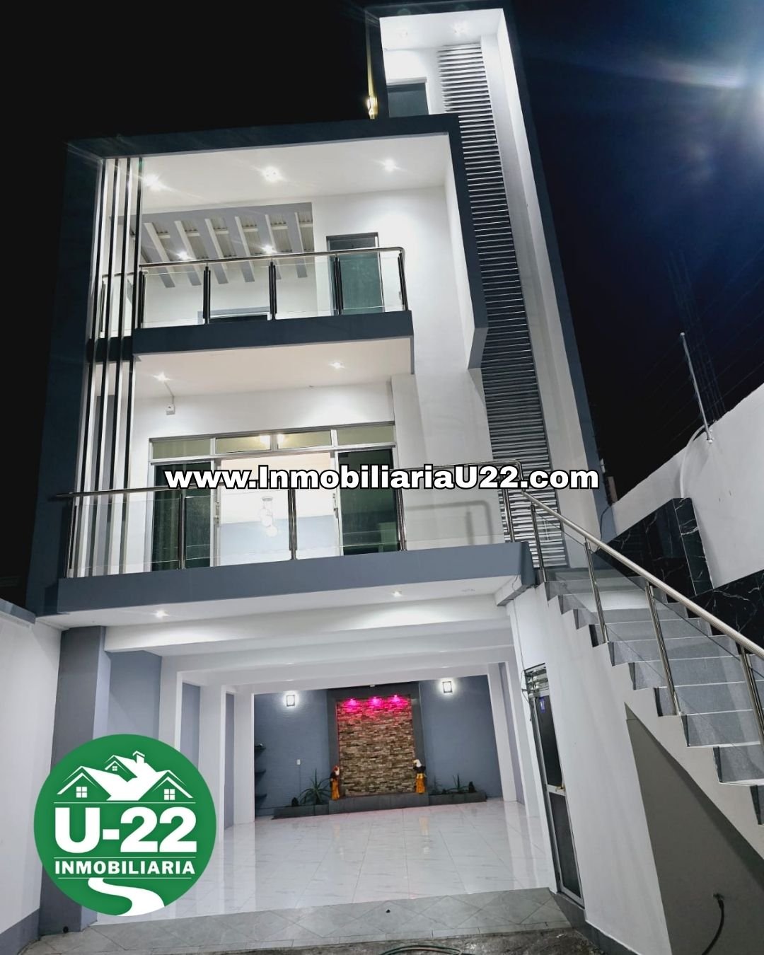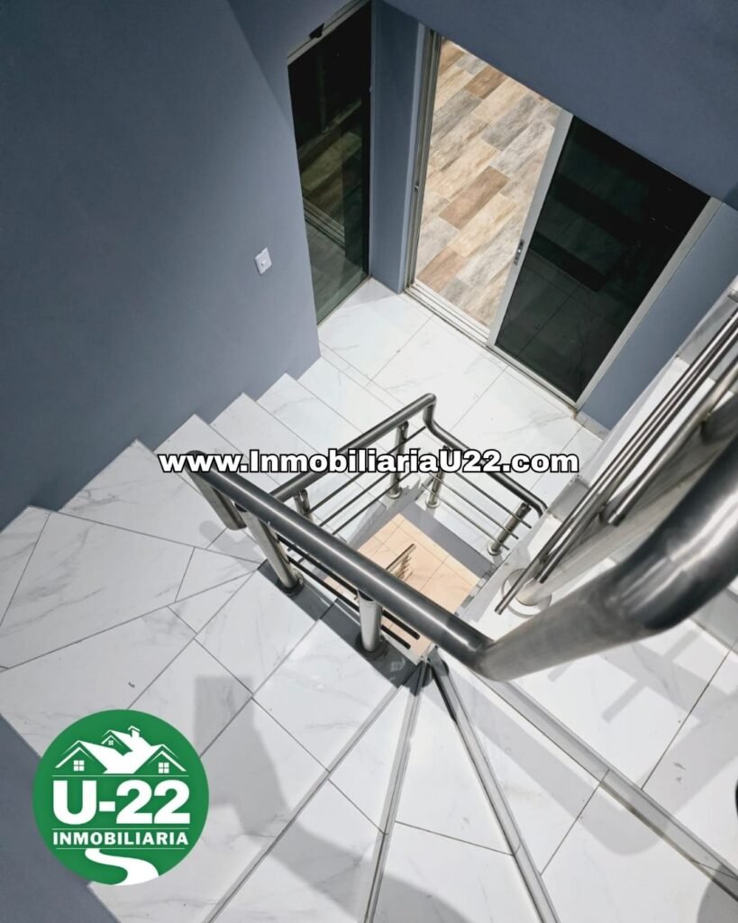 La propiedad ofrece un parqueo techado y completamente cerámico, con una decoración de pared tipo muro piedra iluminado que aporta elegancia desde el primer ingreso.