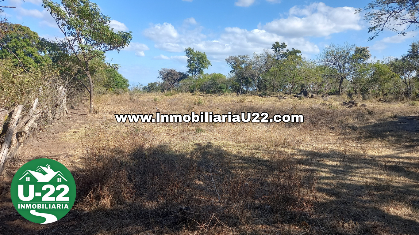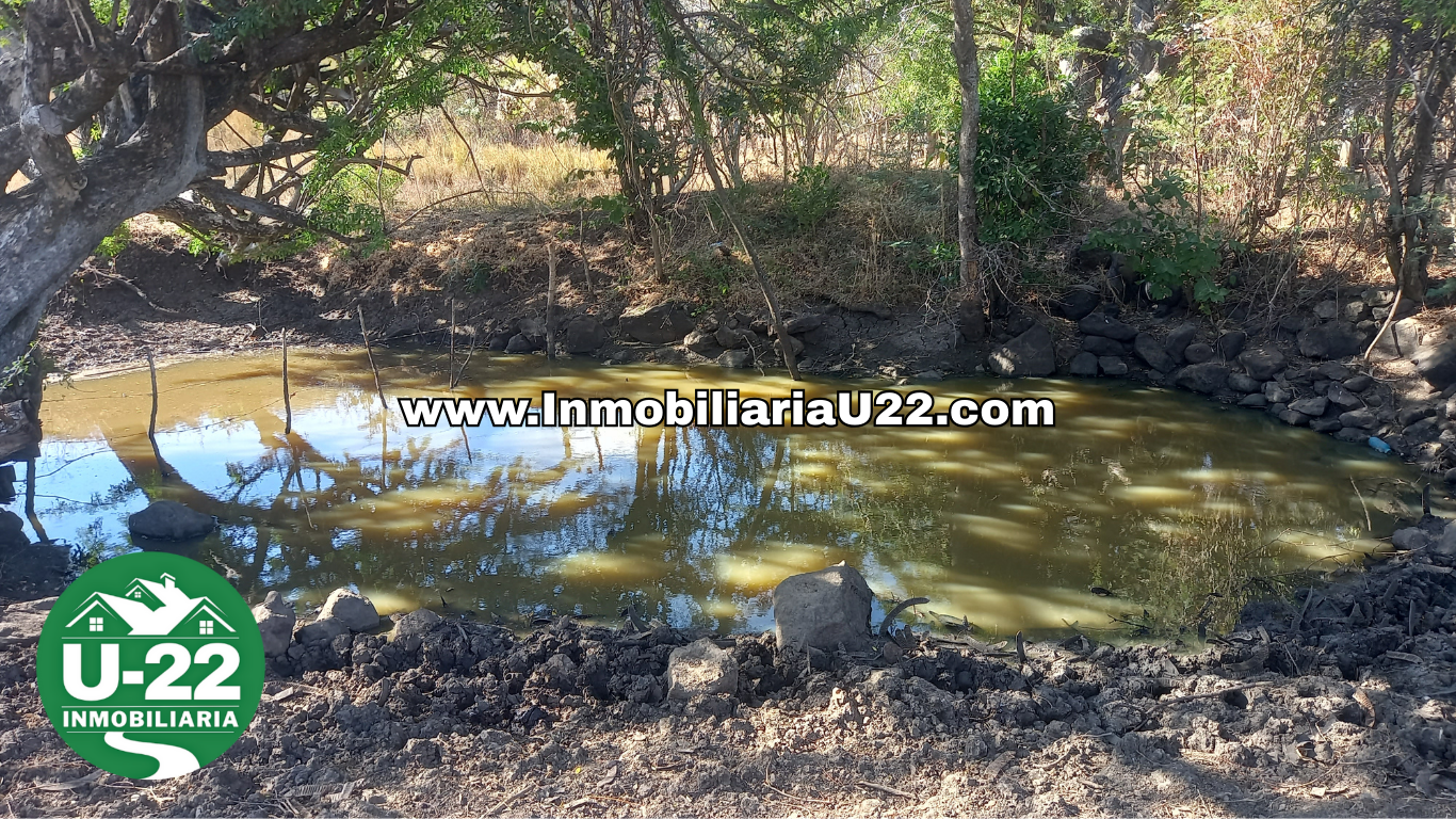 Terreno con poza de agua, área boscosa al fondo y forma alargada que facilita la división en potreros y el manejo del ganado.